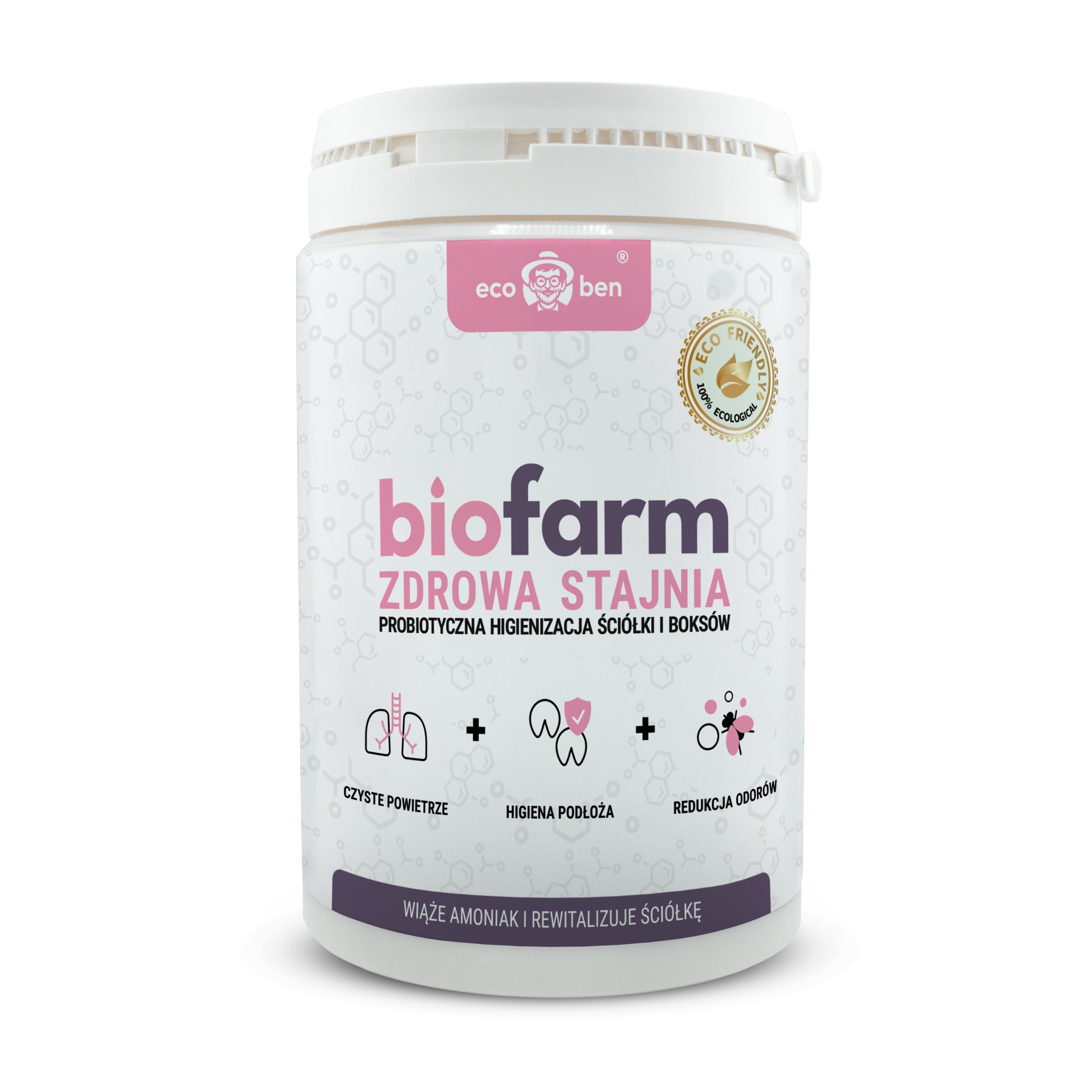 Specjalistyczny biopreparat do higienizacji ściółki i boksów koni. Bakterie Bacillus, bakterie kwasu mlekowego i enzymy rozkładają mocz i obornik u źródła, ograniczając uwalnianie drażniącego amoniaku.